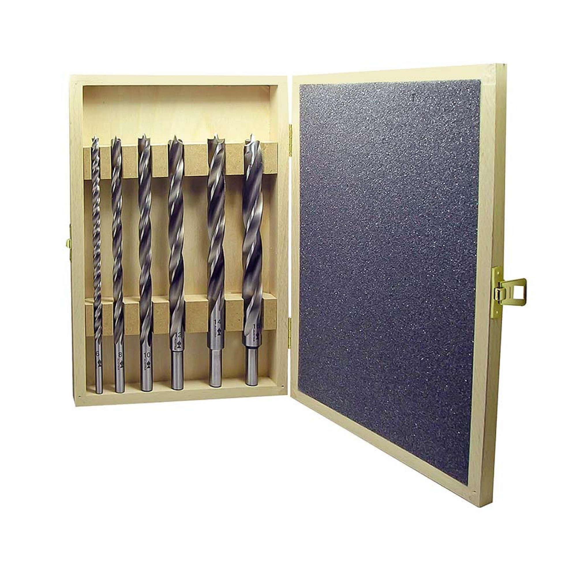 Sada spirálových vrtáků: 6-8-10-12-14-16x200 HSS Provedení: HSS spirálový vrták s vodícím hrotem a 2 řeznými břity. Doporučené otáčky: 1.500 - 3.000 ot/min. Broušená 4 spirálová drážka pro rychlý odvod materiálu, vhodné pro vrtání pod úhlem. Vrták je určen pro přesné vrtání v měkkém a tvrdém dřevu, Multiplexu, MDF a plastech. Použití ve stojanových a ručních vrtačkách, CNC strojích.