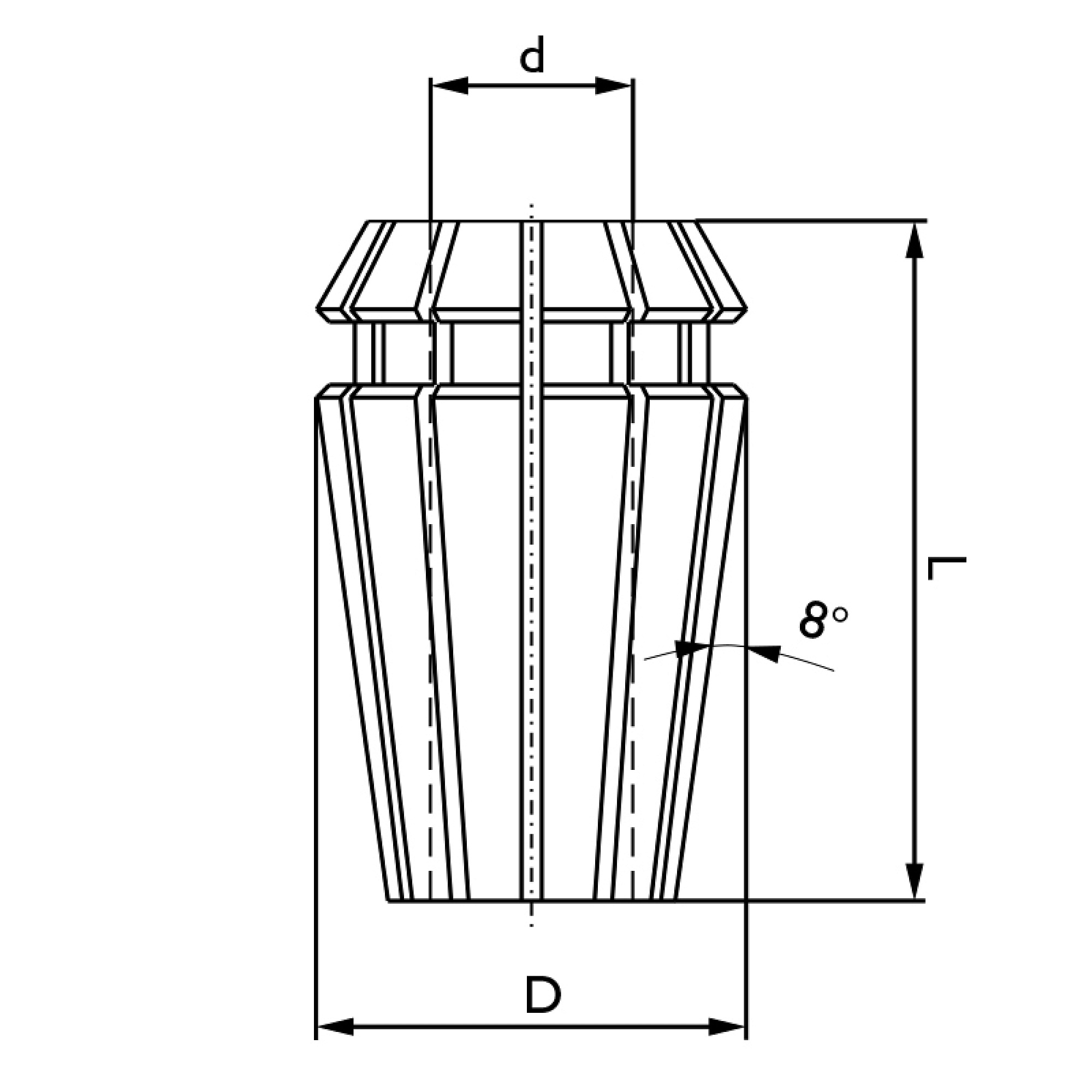 Pro precizní upnutí nástrojů s průměrem upínací stopky 30 mm. Pro kleštinové upínače s kuželovitostí 8° Vysoká upínací síla a vysoká obvodová přesnost je zabezpečena 16-ti drážkami kalené a broušené provedení upínací tolerance 1 mm (kleština s průměrem d = 30 mm umožňuje upnutí stopky s průměrem d = 29 mm)