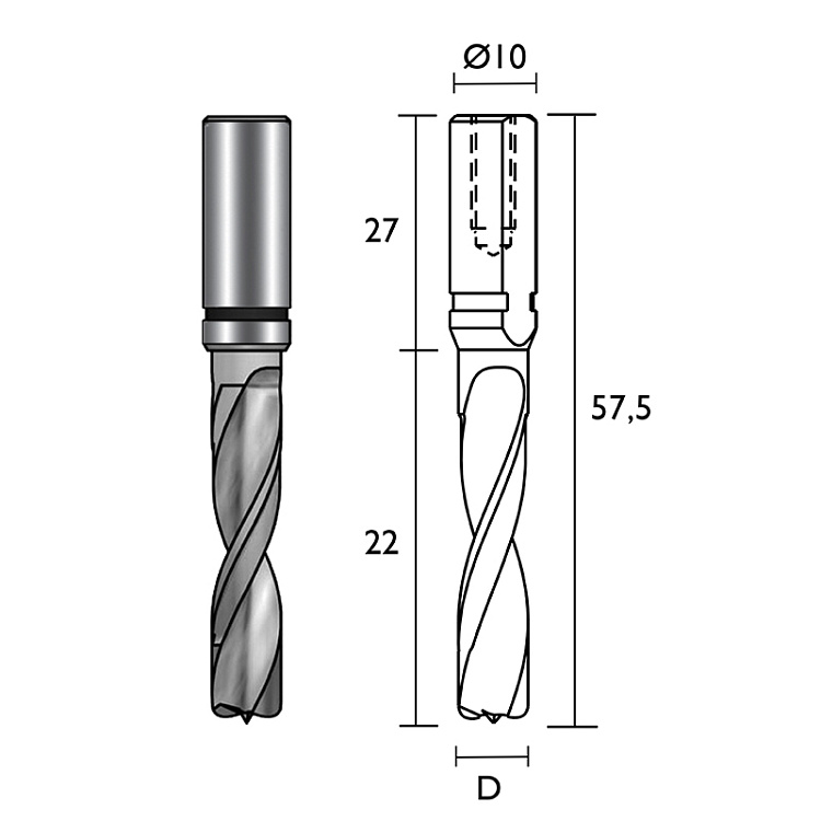 Provedení: HWM-celotvrdokovové monolitní provedení vrtáku. Vrták je určen pro extrémní zatížení. Doporučené otáčky: 3.000-9.000 ot/min. Vrták je určen pro extrémní zatížení, přesné a čisté vrtání v materiálech DTD, MDF, LTD, HPL, Multiplex, plasty, měkké a tvrdé dřevo. Použití: na vrtacích strojích CNC strojích a kolíkovačkách pro vrtání neprůchozích otvorů s možností vyšších otáček a posuvových rychlostí.