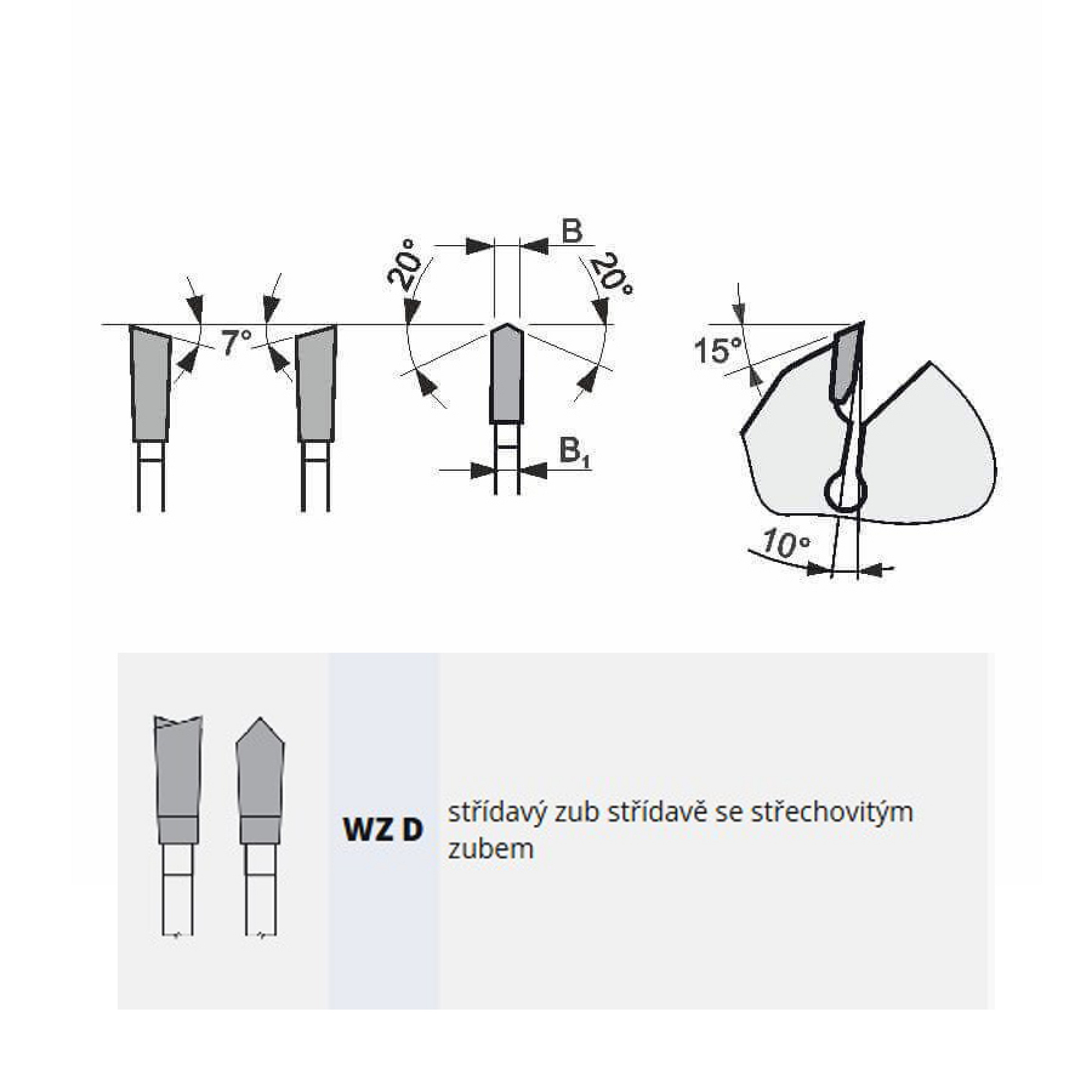 - Střídavý zub (WZ/D) – střídavý zub se střechovitým zubem.