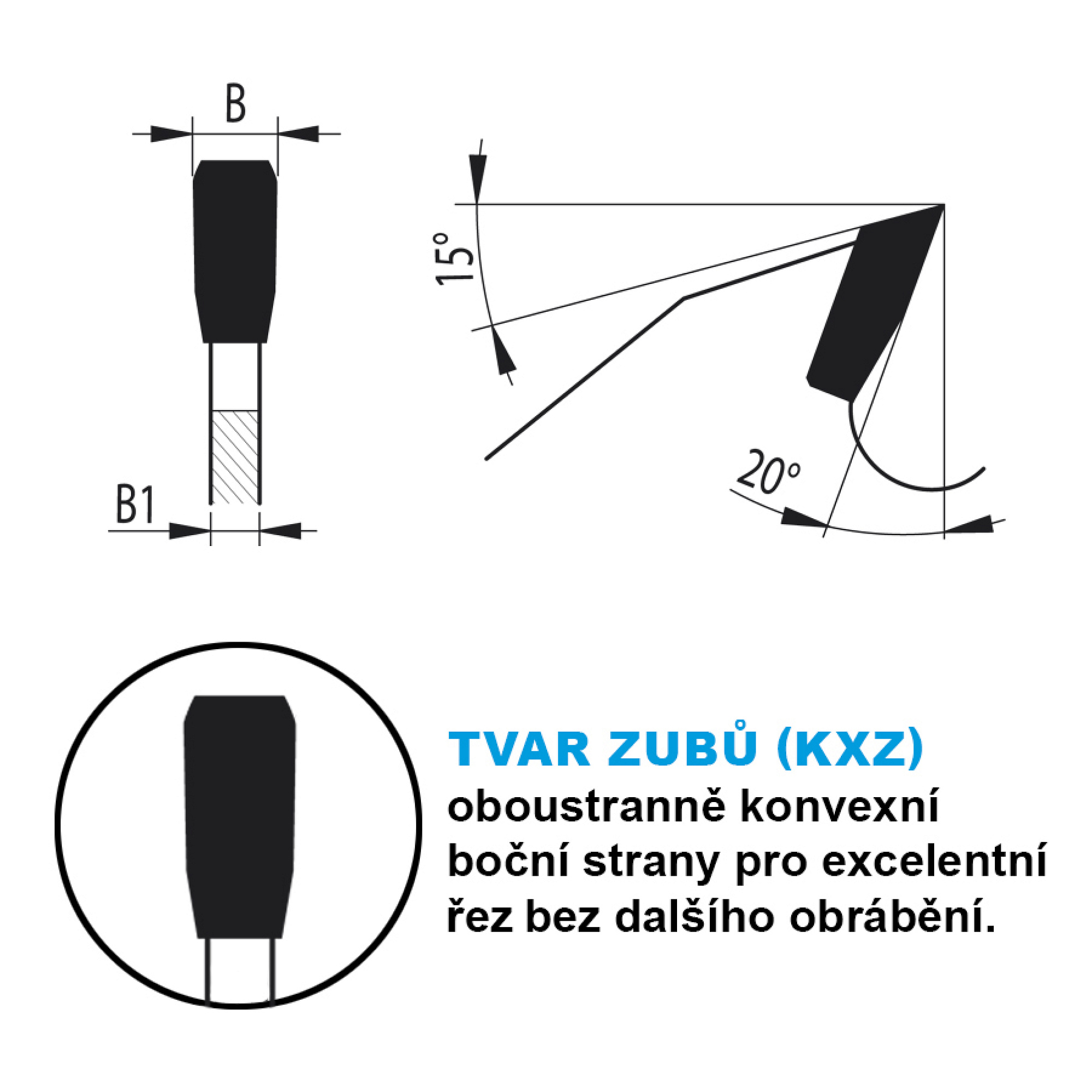 - Univerzální použití – geometrií KXZ je optimalizován pro podélné i příčné dělení dřeva a dřevěných materiálů.