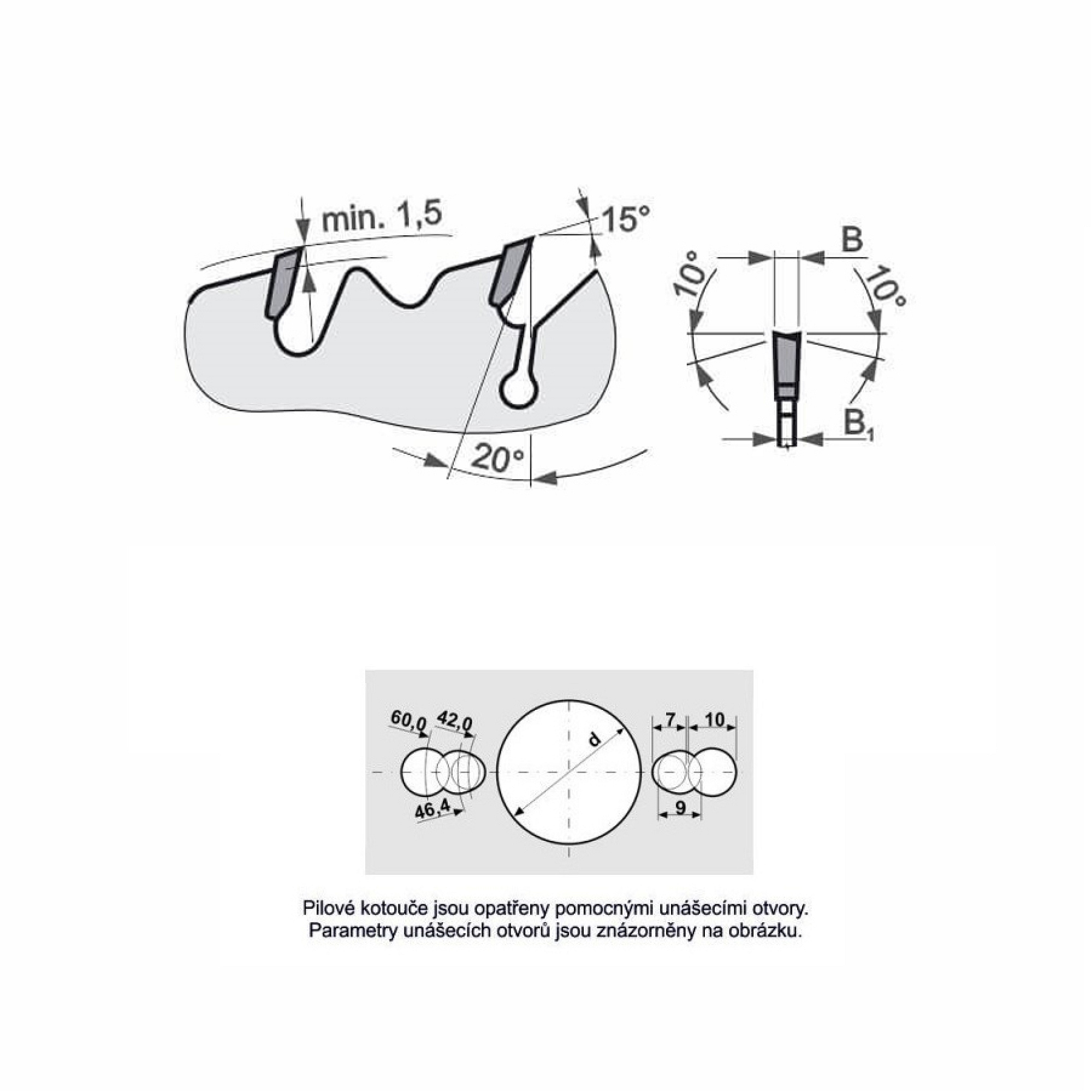 - Pomocné unášecí otvory – zaručují přesnou centrální polohu kotouče na hřídeli, minimalizují vibrace a výrazně zvyšují stabilitu řezu.