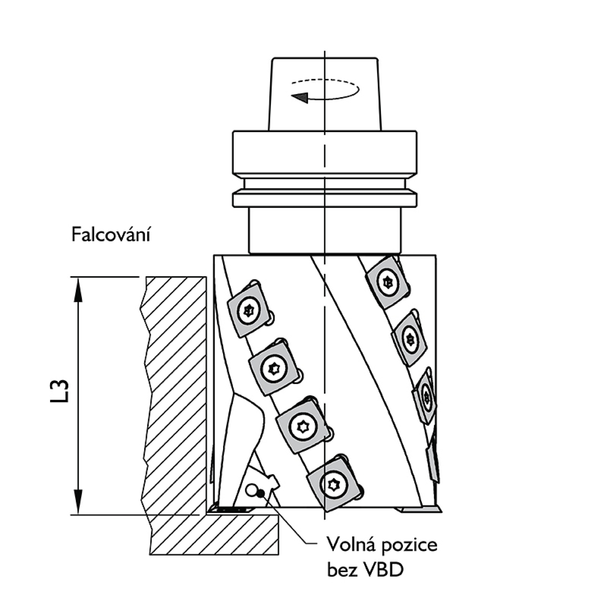 Provedení: HW-VBD R50; Z2 = 4 spirály. Použití: pro CNC obráběcí centra Max. otáčky: 16 000 ot/min. Upínací trn s kuželem HSK F63 je součástí nástroje. Určeno: k příčnému i podélnému formátování, orovnávání a falcování. Obráběný materiál: měkké a tvrdé dřevo, překližka, Multiplex, vícevrstvé lepené dřevo. Tělo nástroje z pevnostní slitiny hliníku. Axiálně uložené destičky HW-VBD 4 řezné hrany s rádiusem R50 (obvod) zajistí vysokou kvalitu opracování. Čelní předřezové nože umožňují čisté frézování falců, polodrážek. Provedení: Z2 = 4 spirály zajistí malé třísky usnadňující průchod odsáváním.